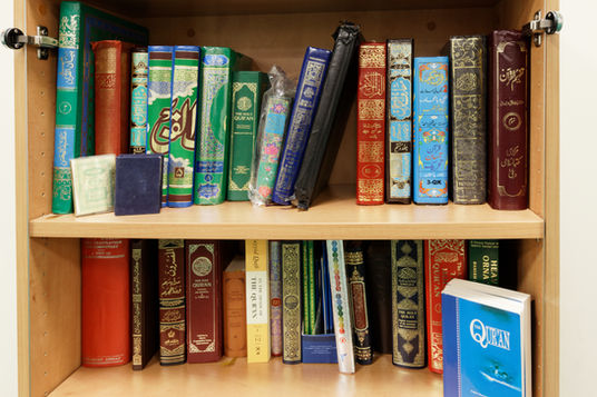 Bookshelves house a wide range of islamic literature, Qurans, hadith and dua books.